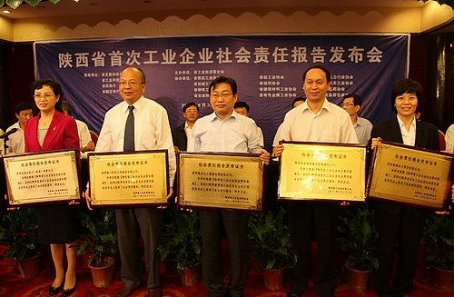 陜煤化集團(tuán)副總經(jīng)理尤西蒂(左三)代表集團(tuán)公司領(lǐng)取社會(huì)責(zé)任報(bào)告發(fā)布證書