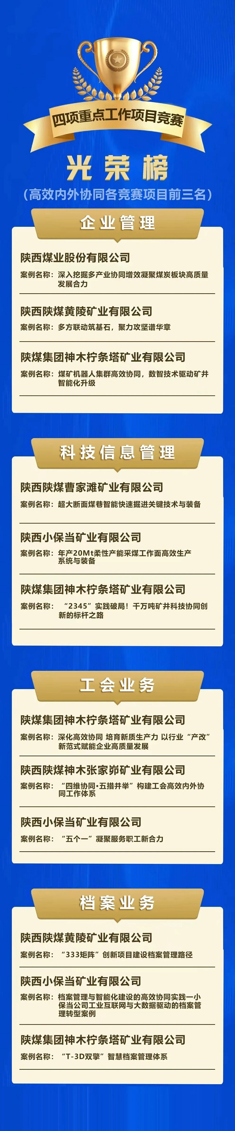 10月23日至24日,陜煤集團在曹家灘礦業(yè)公司舉辦高效內(nèi)外協(xié)同業(yè)務(wù)競賽。62支參賽隊伍在企業(yè)管理、科技信息管理、工會業(yè)務(wù)、檔案業(yè)務(wù)4個賽項中激烈角逐,最終評選出金銀銅獎和金牌案例主創(chuàng)。集團公司黨委委員、工會主席、職工董事李向東及賽項部門負責(zé)人分別為各賽項獲獎單位和個人頒獎。