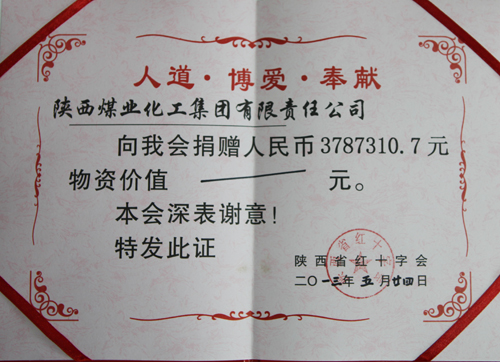 6月5日,陜西省紅十字會(huì)向陜煤化集團(tuán)授予“情系雅安、博愛奉獻(xiàn)”牌匾,并頒發(fā)了捐贈(zèng)證書,對(duì)陜煤化集團(tuán)廣大干部職工向雅安地震災(zāi)區(qū)捐款370余萬(wàn)元以及多年來(lái)積極履行社會(huì)責(zé)任、勇于承擔(dān)社會(huì)公益事業(yè)表示衷心的感謝。