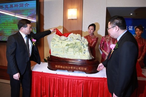 上市儀式上,陜西煤業(yè)化工集團(tuán)公司總經(jīng)理?xiàng)钫涨c上海證劵交易所領(lǐng)導(dǎo)互換了上市紀(jì)念品,隨后,陜西煤業(yè)股份公司總經(jīng)理宋老虎代表公司簽訂了《上市協(xié)議書》。